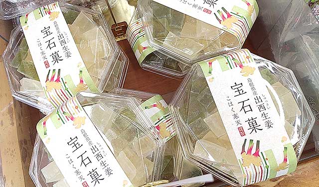 希少性の高い島根出雲市産の出西生姜を使った「出西生姜宝石菓」は、生姜の香りがほどよく効いて、外はシャリッと、中はぷるっとした食感が Good!