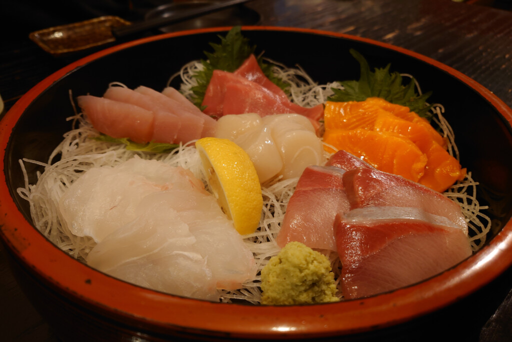 枝豆、ピリ辛きゅうり、海鮮サラダ、刺身盛り合わせ(マグロ、ハマチ、サーモン、ほたて)。