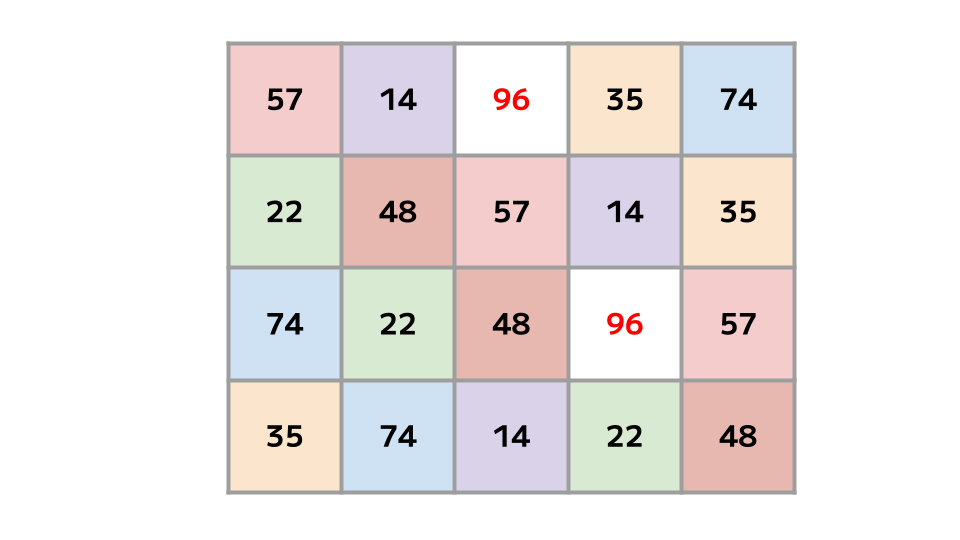 これをみると、表中に96が2つしかないことがしっかり確認できますね!!