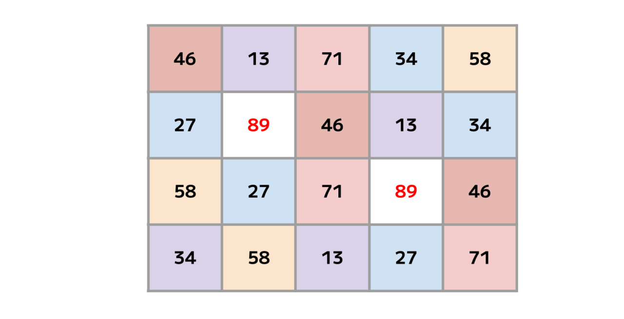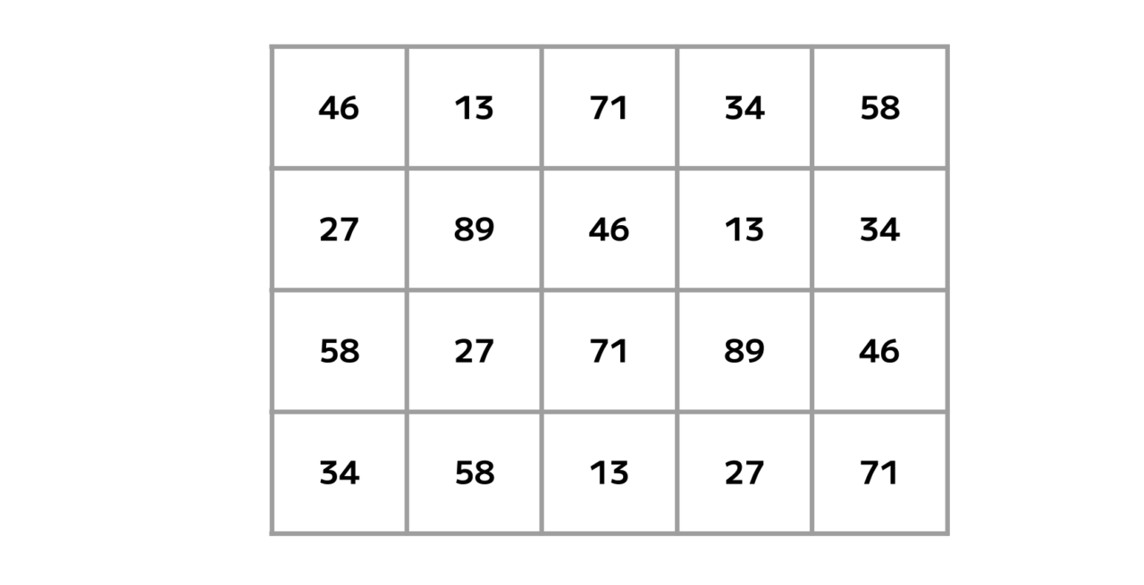 表を埋める「13・27・34・46・58・71・89」という7種の数字。