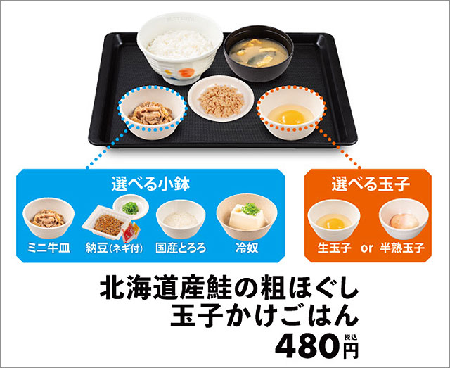 1月14日から、松屋で朝5~11時の朝食メニューに登場する「北海道産鮭の粗ほぐし玉子かけごはん」480円だ!