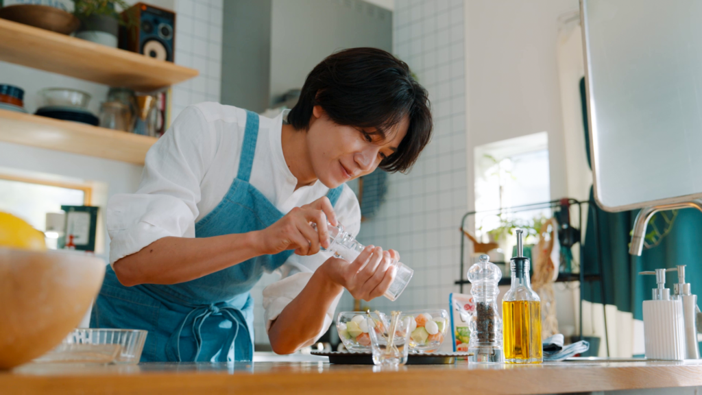 撮影を終えた後のインタビューでは、「普段料理はする方なんですけど、撮影で手元を写している中で切ったりするのが今までの人生でなかったので、すごく緊張しました」。
