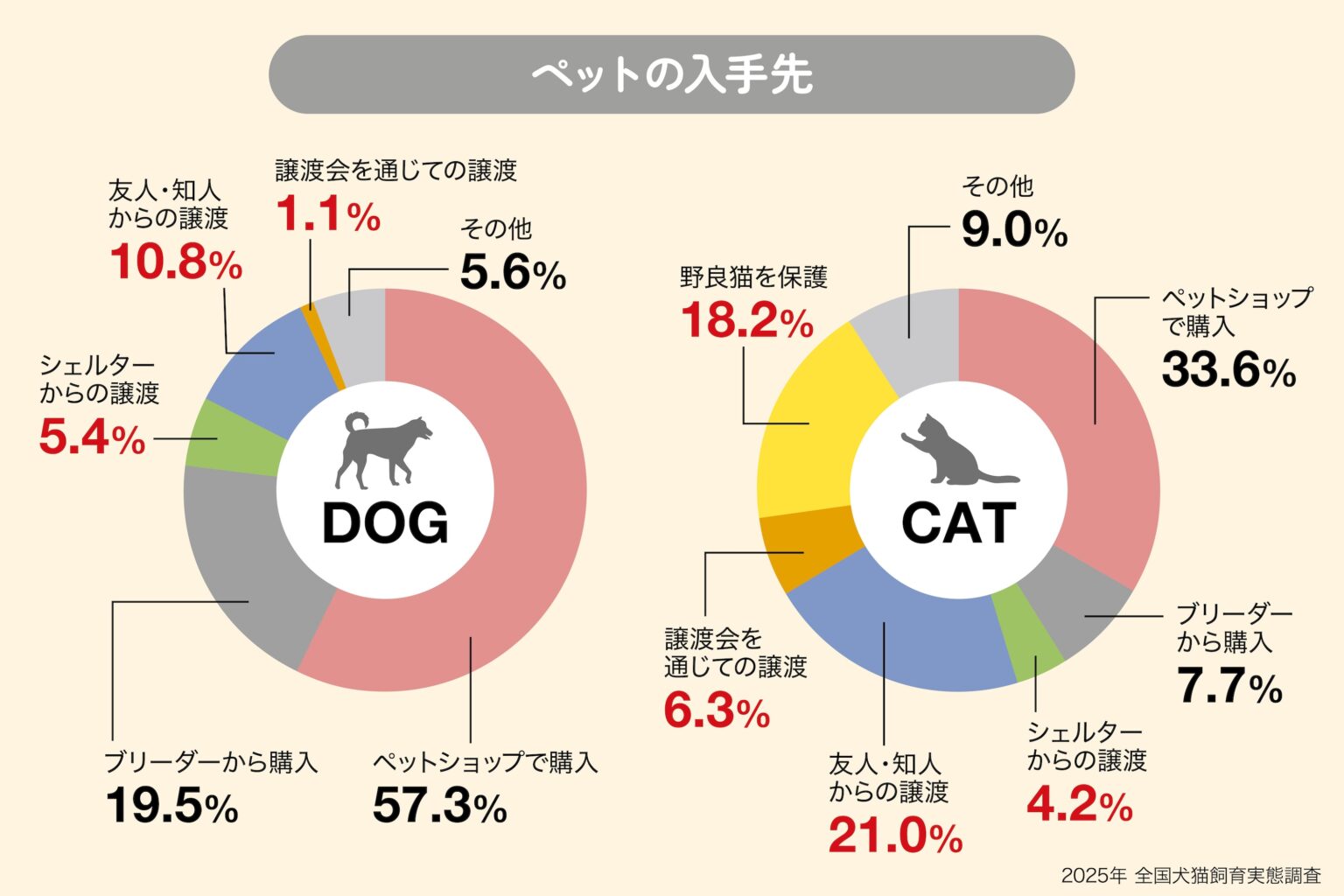 ペットの入手先は、犬の場合、「ペットショップで購入」(57.3%)がもっとも多く、次いで「ブリーダーから購入」(19.5%)となっています。猫の場合は、「ペットショップで購入」(33.6%)、「友人・知人からの譲渡」(21.0%)の順になります。