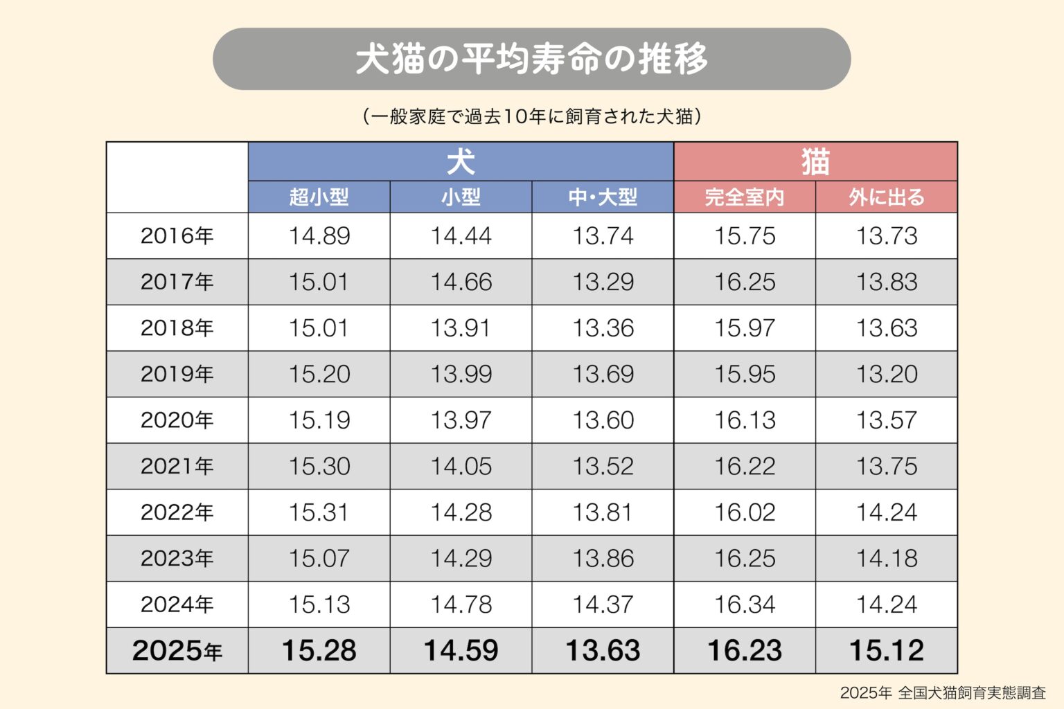 平均寿命は、犬全体が「14.82歳」、猫全体は「16.00歳」という結果が出ています。種別ごとの平均寿命は、犬の場合、超小型犬「15.28歳」、小型犬「14.59歳」、中・大型犬「13.63歳」。猫は、完全室内飼いが「16.23歳」、外に出る猫が「15.12歳」となり、犬も猫もほぼ横ばいで推移しています。