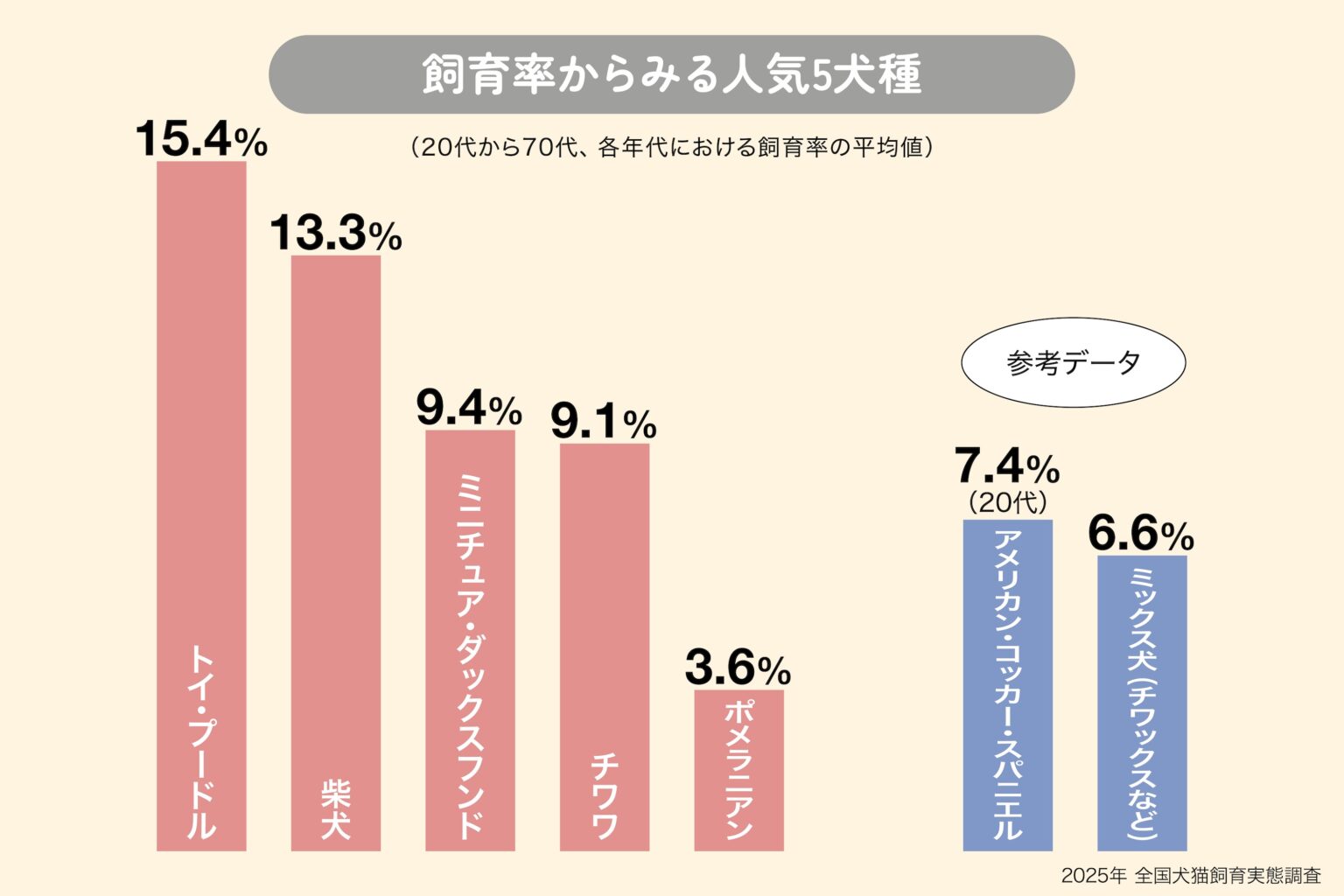 興味深いのは、上のグラフで参考データとしてご紹介していますが、「アメリカン・コッカー・スパニエル」が20代での飼育率が高く、若い方に人気の犬種となっているようです。また、近年、チワックスやマルプーといった純血種同士をミックスさせた「ミックス犬・ハーフ犬」の人気も高まってきているようです。