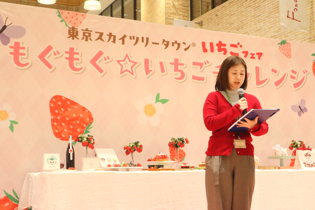 冒頭では、東京スカイツリータウン広報事務局の原島朋子氏が登壇し、「いちごフェア」の開催概要や見どころを説明した。