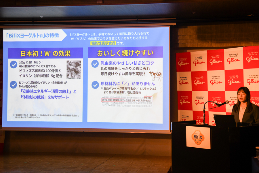 肥満抑制に効果がある短鎖脂肪酸を腸内に生み出すヨーグルトブランドの新商品『BifiXヨーグルトα』を3月2日に発売する江崎グリコが、同商品の発表会を1月16日に東京都内で行った。「安静時のエネルギー消費の向上」と「体脂肪の低減」をダブルでサポートする初の機能性表示食品として、消費者の高い期待が予想される本商品。会場では商品ラインナップのほか、開発担当者から研究開発のこだわりや健康効果のメカニズムが紹介された。