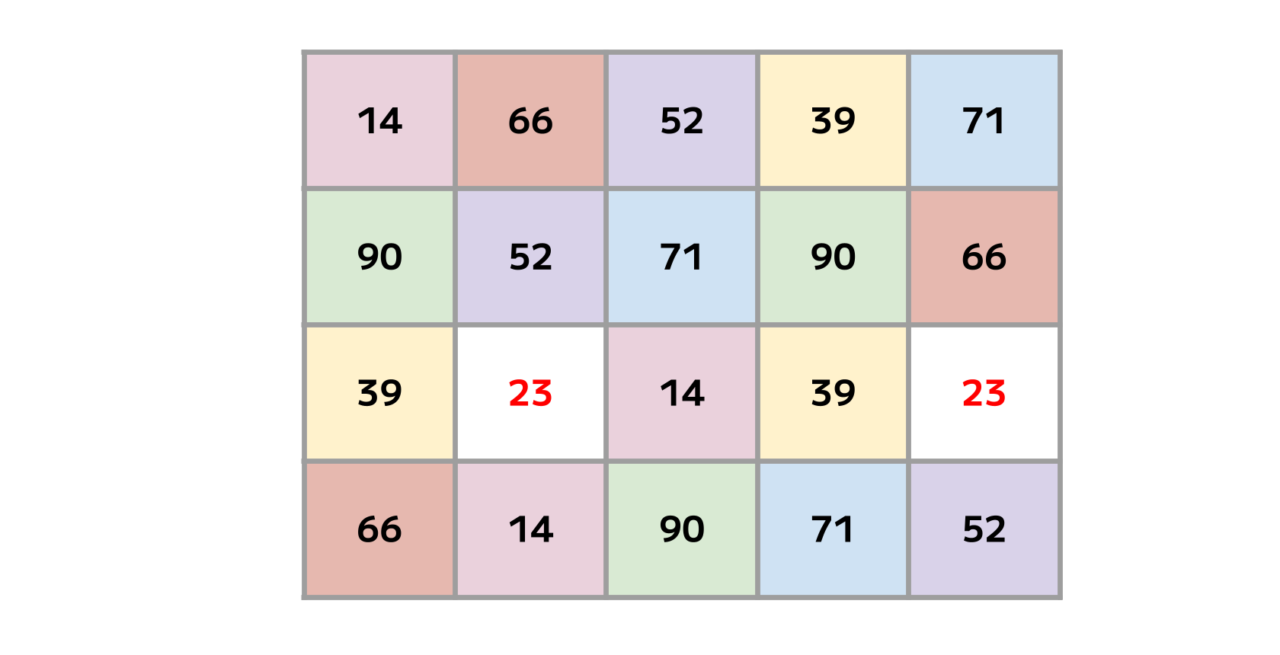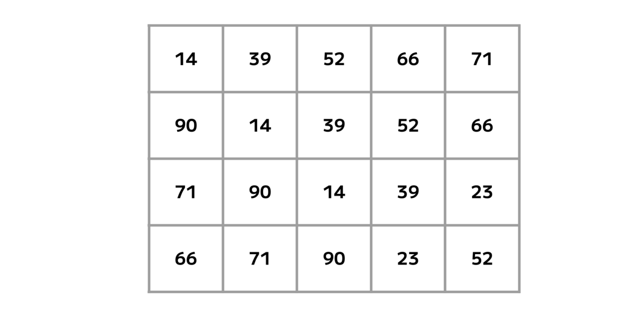 表を埋める「14・23・39・52・66・71・90」という7種の数字。