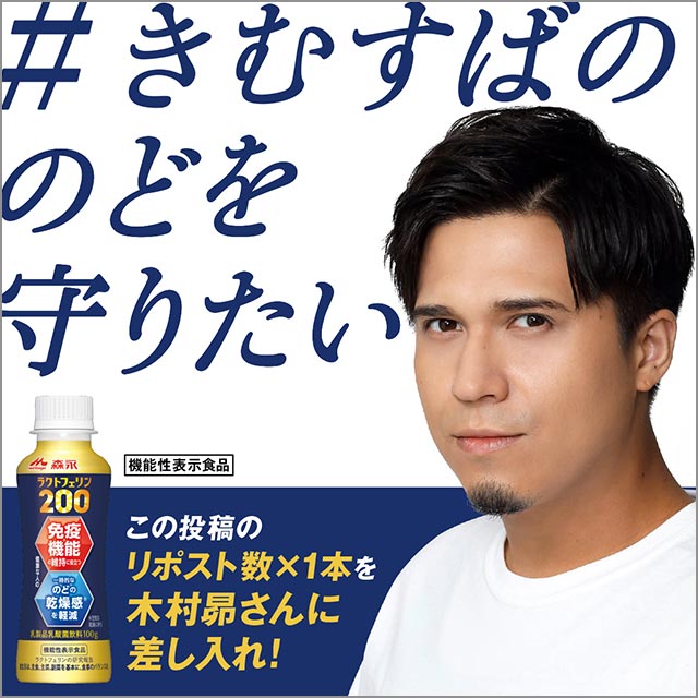 この「森永ラクトフェリン200ドリンクタイプ」を、「とくにこの時期はのどの調子に気をつかうことが多い」という木村昴に、X投稿で差し入れできるおもしろい企画が 1月19~22日 の3日間、開催中。