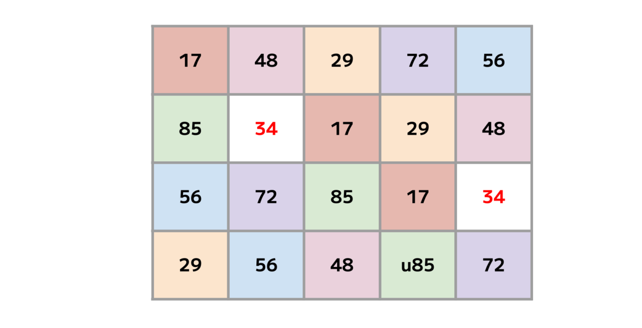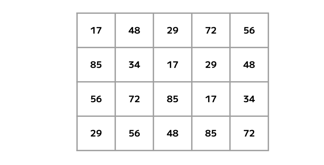 表を埋める「17・29・34・48・56・72・85」という7種の数字。
