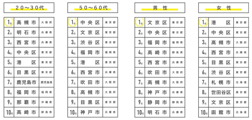 調査結果を詳しく見ると、世代や性別によって評価される街が大きく異なることも明らかになった。20〜30代では高槻市や明石市、西宮市といった関西圏の都市が上位を占め、地域活動への参加意識やコミットメントの高さが特徴として挙げられている。