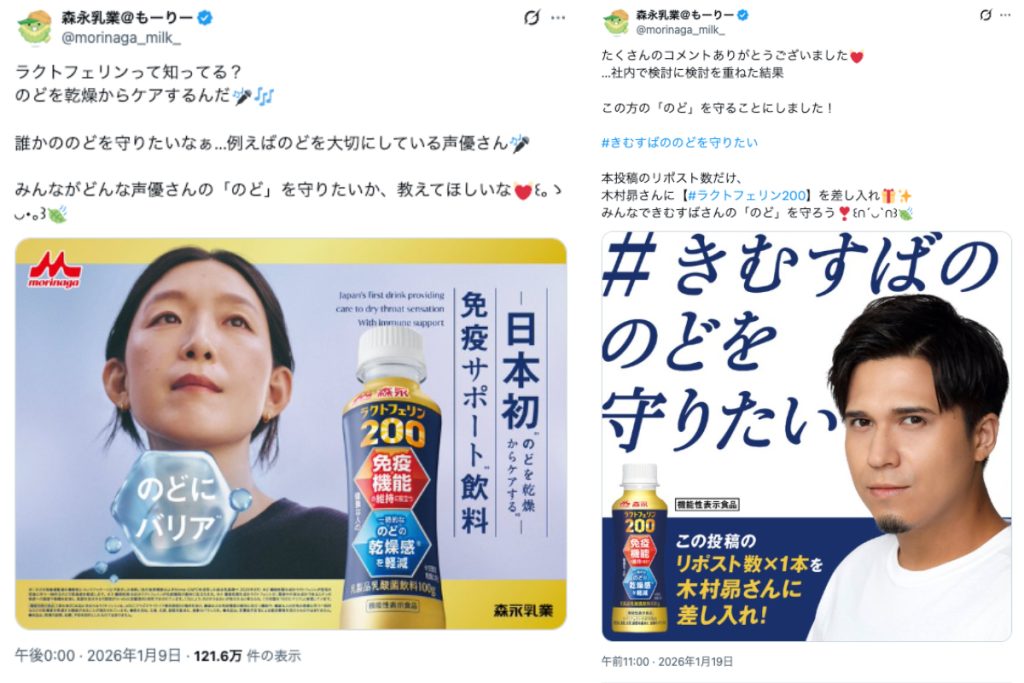 本キャンペーンの出発点は、森永乳業の公式Xアカウント「@もーりー」による何気ない一言だった。「ラクトフェリンで、声優さんの“のど”を守りたい」という呼びかけに対し、SNS上では「推しののどを守ってほしい」という声が次々と寄せられ、想像以上の反響を生んだ。