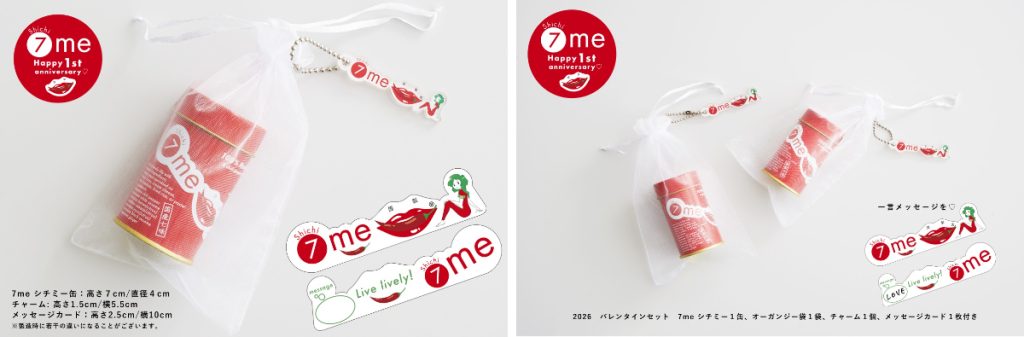 ふたつ目は、シチミー1缶にオーガンジー袋、チャーム、メッセージカードが付属するバレンタインセットである。気持ちを言葉と形で伝えたい人に向いた仕様となっている。