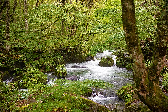 奥入瀬渓流(画像)では苔に囲まれたトレッキングが楽しめ、冬季は氷瀑鑑賞ツアーも開催される。