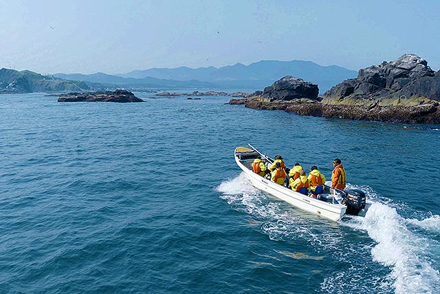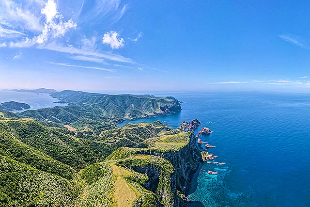 隠岐諸島では、 「摩天崖(まてんがい)」や「赤壁」など大地の動きや浸食により生み出された独特な断崖や海岸景観が広がり、山岳エリアとはまったく異なる自然の表情に出会える。