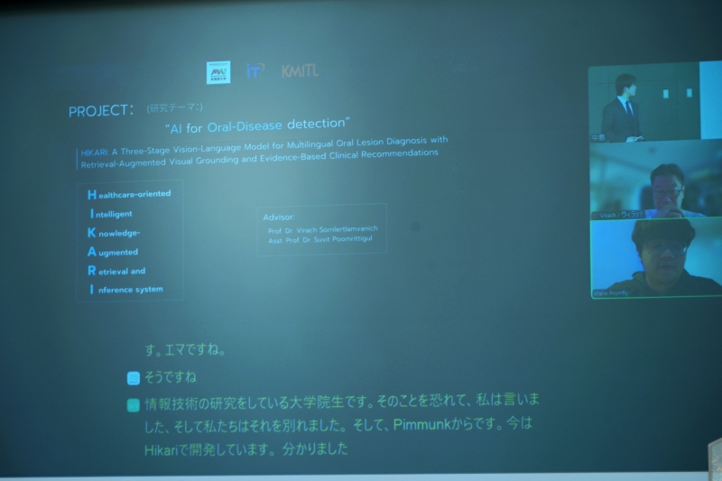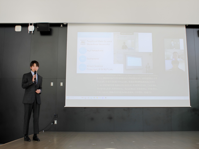 中島さんは言語表現の意図を解釈するAIシステム、ワーティンさんは医師の説明を多言語に対応させる言語システム について、それぞれの研究内容を発表。英語で進行した発表は、スクリーンに日本語字幕としてリアルタイムに表示されました。