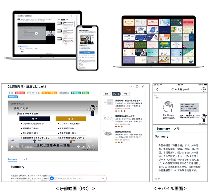 まず学習コンテンツ。DXやAIなどビジネスに直結するテーマを中心に1000本以上が提供されます。必要に応じて専門性の高いオプションも追加でき、企業ごとに柔軟な活用が可能です。