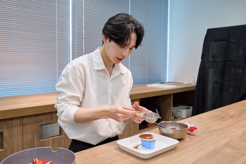 ココアパウダーは、ココアの香ばしい香りも楽しめるようにしっかりとかけるのがおすすめだという。いちごはお好みでいいそうだが、酸味の効いたフルーツを乗せるとよりおいしくいただける。また、「冷蔵庫で30分~1時間、冷凍庫で10分冷やすともっちりと濃厚になる」と、ワンポイントも紹介した。