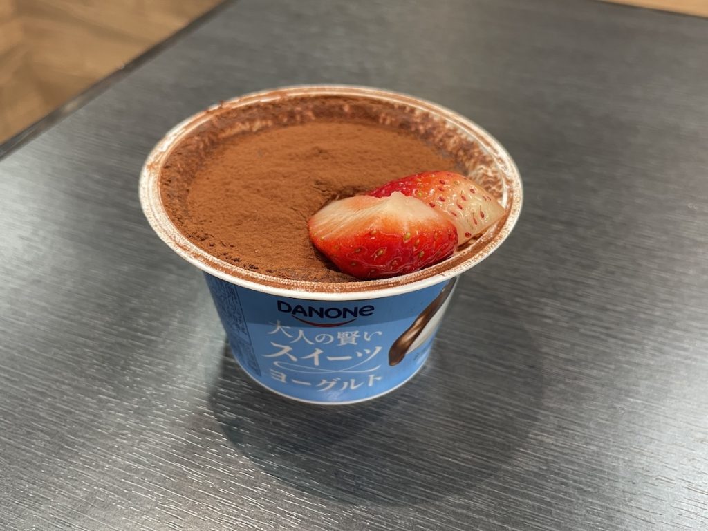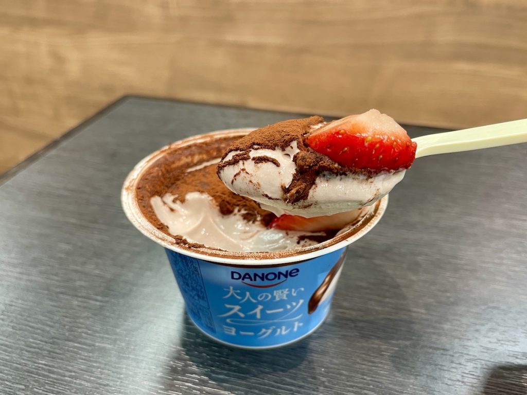 食べてみると、ふわっとした食感が楽しめ、よりクリーミーさが増したまろやかな味わい。ココアパウダーがカカオ感と香りを高めていて、ヨーグルト版ティラミスのようなスイーツに。甘酸っぱいいちごとも相性抜群。見た目も良く、手軽に作ったとは思えない本格スイーツデザートになるので、バレンタインのデザートにもおすすめだ。