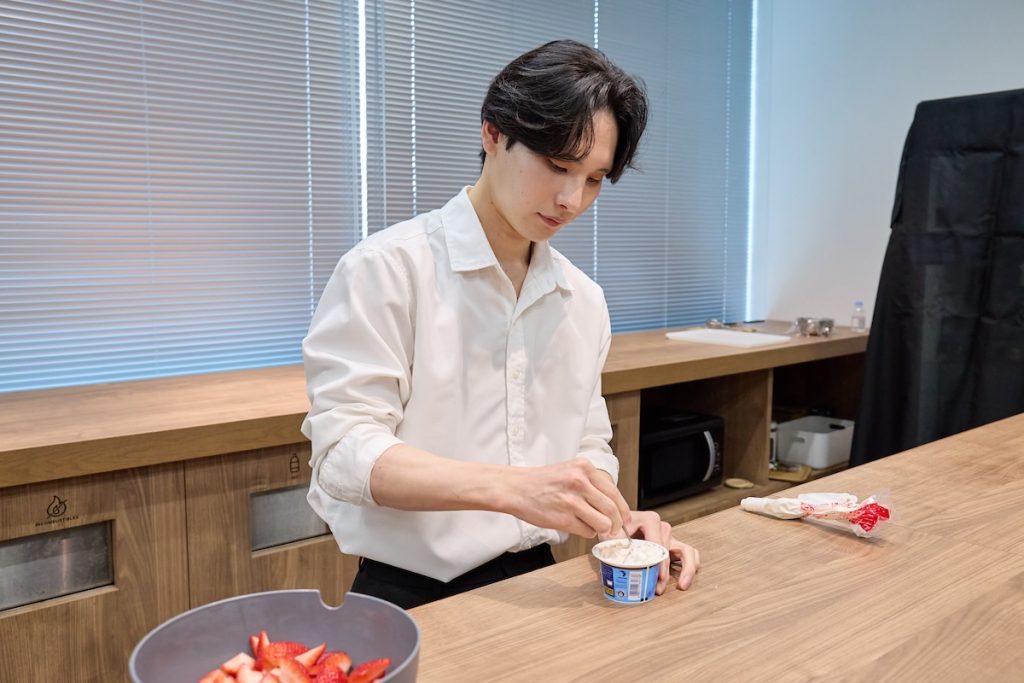 今回、syun cookingさんが考案したのは、バレンタインデーシーズンにぴったりな「生チョコムース」。材料は、『ダノン 大人の賢いスイーツヨーグルト ショコラフォンデュ』と市販のホイップクリーム、仕上げにココアパウダーといちごを用意。市販のホイップクリームを使うことで泡立てる手間を省く、というのも「できるだけ手間を取り除きたい」というsyun cookingさんのこだわりだ。