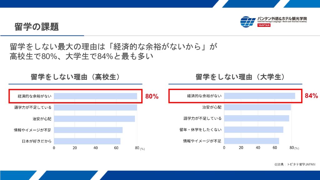文科省の留学促進キャンペーン「トビタテ!留学JAPAN」によると、留学をしない理由の約8割が「経済的な余裕のなさ」を挙げている。