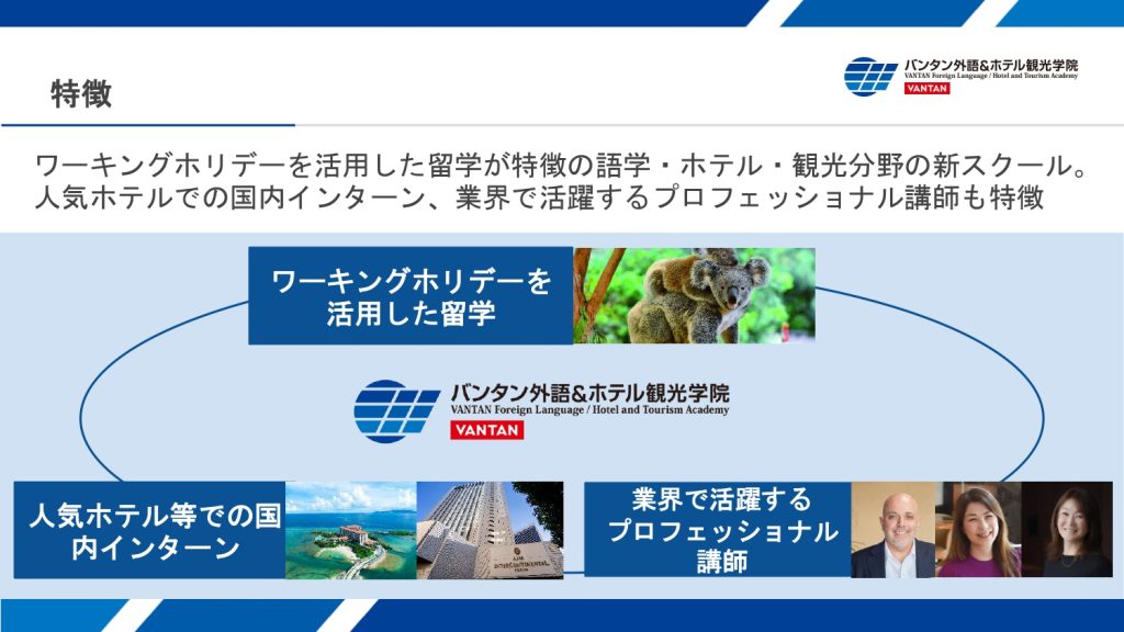 このギャップをどう埋めるのか——。この背景で設立されたのが、語学・ホテル・観光分野に特化した『バンタン外語&ホテル観光学院』だ。同校では、ワーキングホリデー制度をカリキュラム化(3年制専門部・大学部)。これにより、実践的な語学力と実務経験を育成していく。
