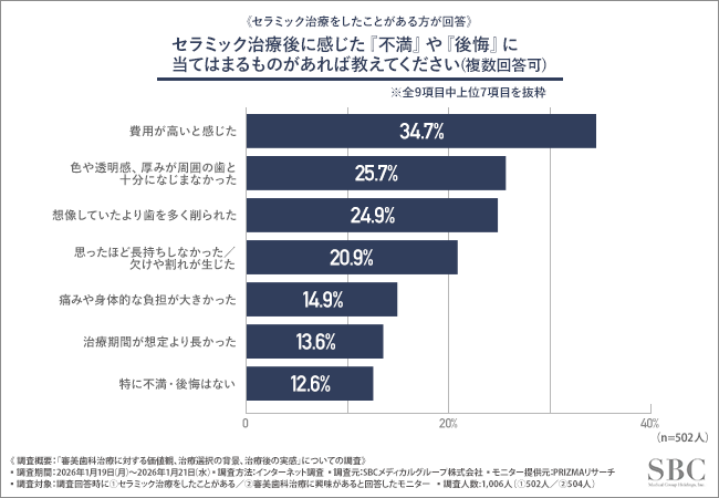 セラミック治療を経験した人に対する調査では、治療後に感じた不満や後悔として「費用が高いと感じた」が34.7%で最も多かった。次いで「色や透明感、厚みが周囲の歯と十分になじまなかった」(25.7%)、「想像していたより歯を多く削られた」(24.9%)が続く。仕上がりへの違和感や削る量への認識の差が、ギャップとして表れている。
