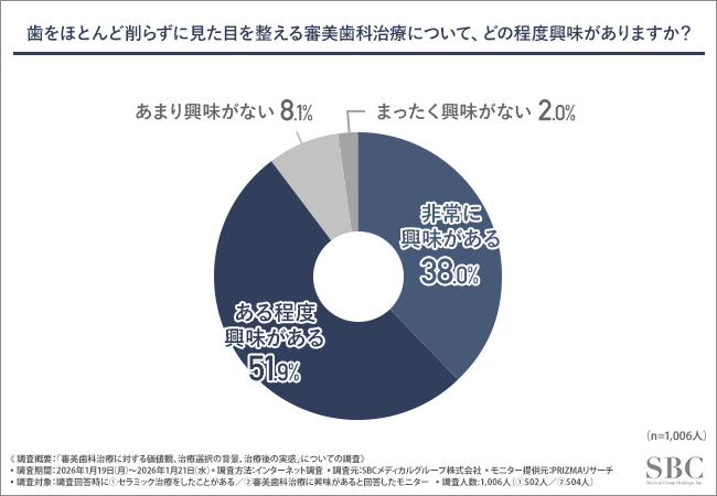 さらに、歯をほとんど削らずに見た目を整える治療への関心については、「非常に興味がある」が38.0%、「ある程度興味がある」が51.9%と、約9割が前向きな姿勢を示している。審美性と同時に歯の保存を重視する価値観が広がっていることは明白であり、低侵襲であることが今後の審美歯科選択の重要な軸になりつつあるのである。