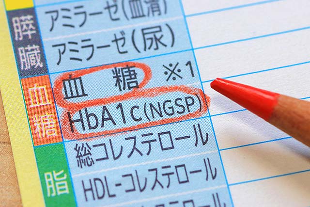 ここで HbA1c(ヘモグロビン・エーワンシー)とは、血液中の赤血球にあるヘモグロビンとブドウ糖が結合した割合(%)を示し、過去1~2か月間の平均的な血糖値の推移を示す中長期的な指標。