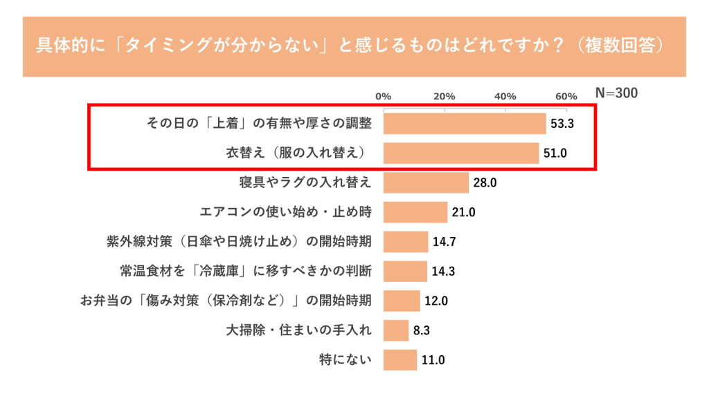また、季節の変わり目が曖昧になったことで、日々の判断に迷いが生じている実態も浮き彫りになった。特に「その日の上着の有無や厚さの調整」や「衣替えのタイミング」に悩む声が多く、予測不能な気候が生活者のストレス源となっている。