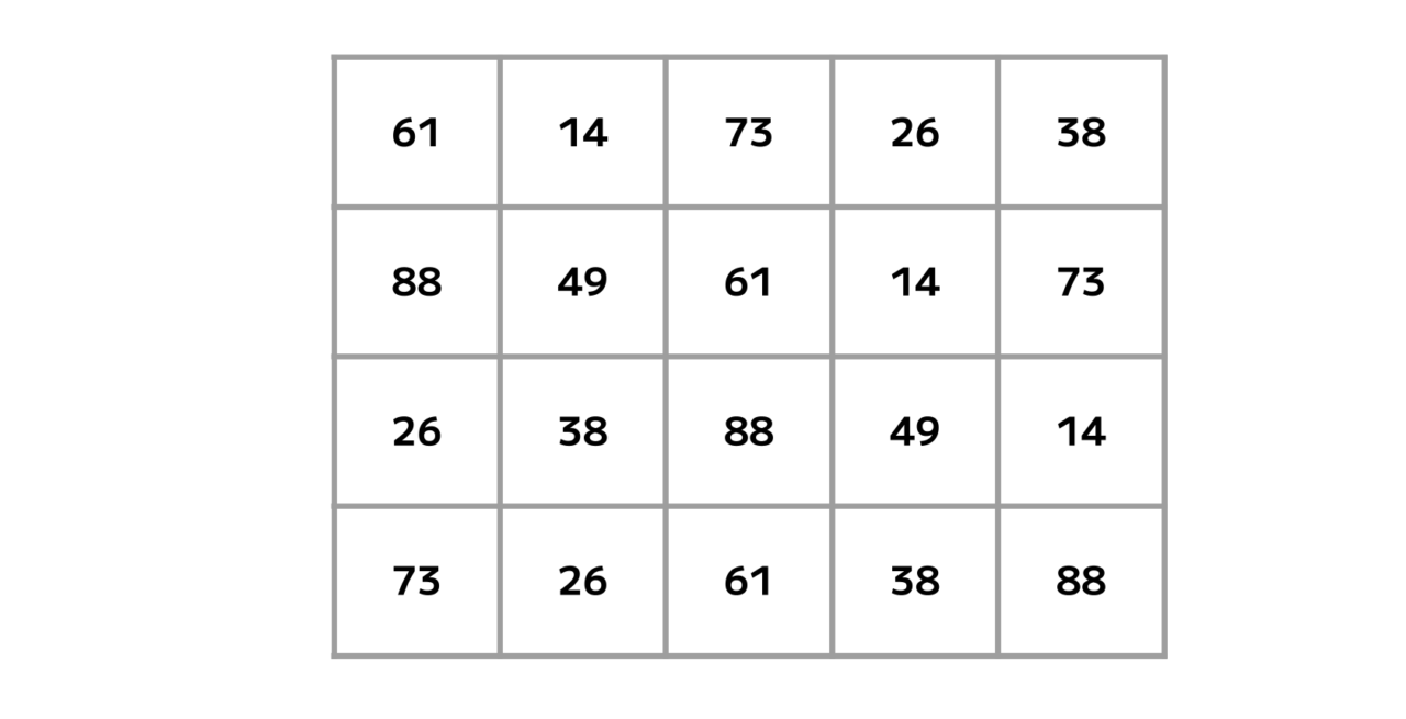 表を埋める「14・26・38・49・61・73・88」という7種の数字。