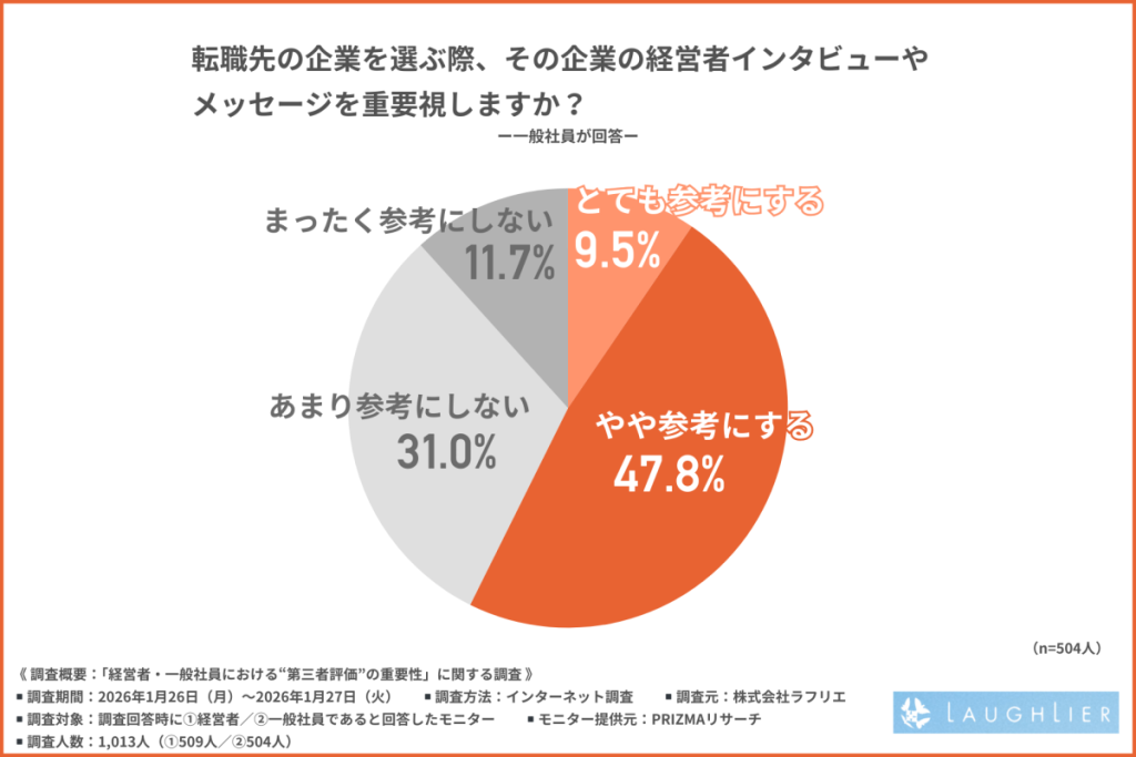 企業を選ぶという行為は、かつては給与や勤務地、福利厚生といった「条件」の比較が中心であった。しかし現在、ビジネスパーソンが意思決定を行う際に参照する情報は大きく変化している。公式サイトや会社案内よりも先に検索されるのは口コミやレビュー、メディア掲載実績といった“第三者の声”である。企業が自ら語る魅力よりも、他者がどう評価しているかが信頼性を測る物差しになっているのだ。この傾向は転職市場だけでなく、営業活動や新規取引の場面にも広がっている。信用は主観ではなく、客観的な評価として可視化される時代に入ったのである。そこで今回、株式会社ラフリエ(https://www.laugh-lier.co.jp/)は、「経営者・一般社員における“第三者評価”の重要性」に関する調査を実施した。