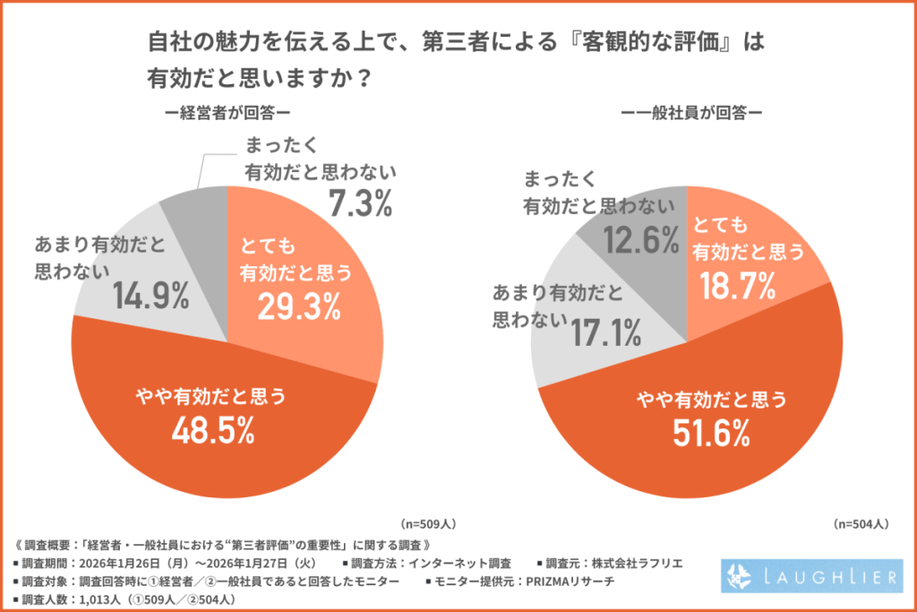 自社の魅力を伝えるうえで、第三者による「客観的な評価」は有効か――この問いに対し、経営者の77.8%(「とても有効だと思う」29.3%、「やや有効だと思う」48.5%)、一般社員の70.3%(同18.7%、51.6%)が肯定的に回答した。立場の違いを越えて、多くが第三者評価を“有効な武器”と認識していることが分かる。