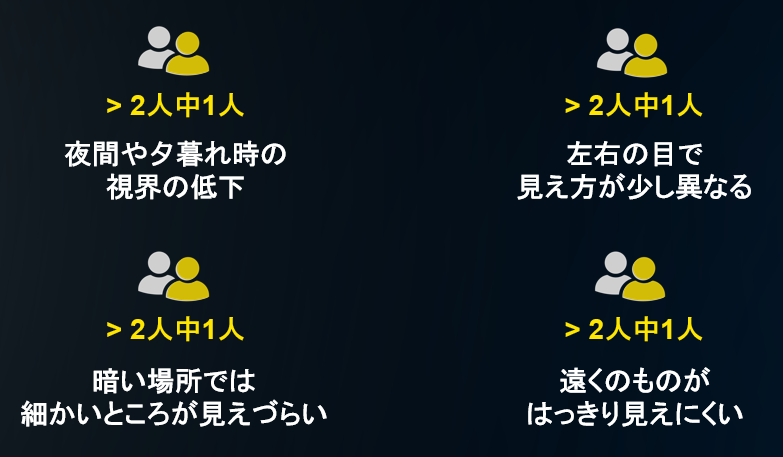 単焦点レンズ使用者の約9割は、現在のレンズに「満足している」と回答しているという。一見すると高い満足度である。しかし、詳細な調査を行うと、夜間や夕暮れ時の視力低下、遠くのものがはっきり見えにくい、左右の目で見え方が異なるといった不満が少なからず存在していることが明らかになっている。