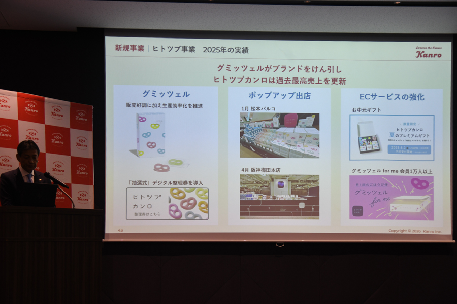 続いて新規事業の取り組みについて。直営店・ヒトツブカンロを展開する「ヒトツブ事業」は、次世代食感グミの『グミッツェル』がブランドを牽引し、過去最高の売上を更新。長野の松本、大阪の梅田、そして新宿に出店したポップアップショップもいずれも好調で、村田社長は「グミッツェルについては生産体制の強化、生産効率化を図り、より多くのお客様にお買い求めいただける環境を整えたい」と話す。