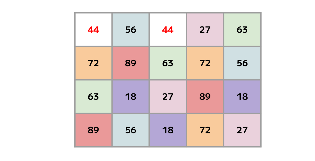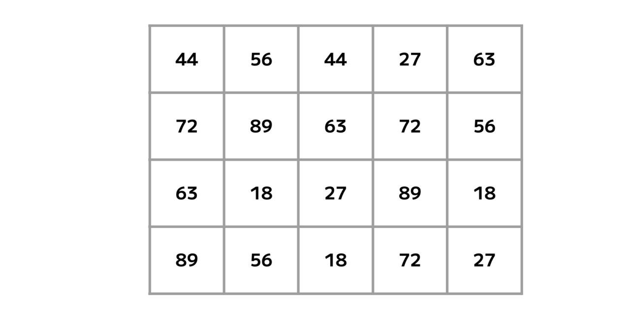 表を埋める「18・27・44・56・63・72・89」という7種の数字。