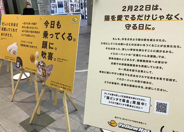 イエローハットは、2月22日 猫の日 にあわせ、WEB・リアルイベント・店舗イベントなどで、いろいろな「猫を交通事故から守るアクション」を展開中↓↓↓