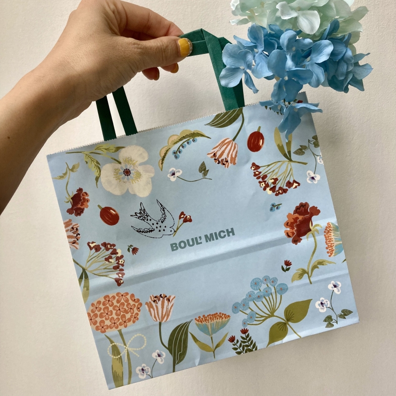 春色のパッケージに包まれたスイーツたちを、専用の紙袋に入れてお渡しすれば、ギフト感もぐっとアップ。中身はもちろん、持ち帰る時間や手にした瞬間のときめきまできちんと大切にしてくれるのがブールミッシュの良いところ。