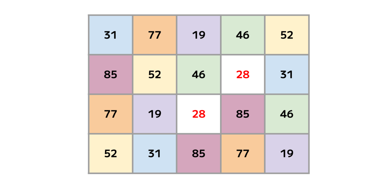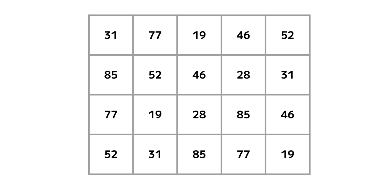 表を埋める「19・28・31・46・52・77・85」という7種の数字。