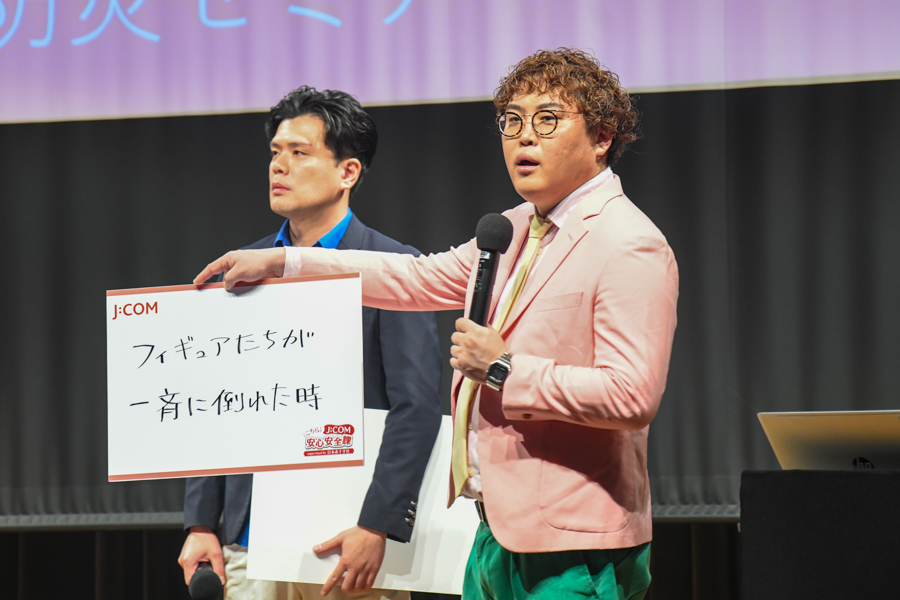 トークセッションの最後は、マユリカの二人が「自分の避難スイッチが入る時」を披露し、阪本が「血がいっぱい出た時」、中谷が「フィギュアたちが一斉に倒れた時」と回答。阪本の答えについてはさておき、「フィギュアが倒れるということは、小さいながらも地震が来ているという合図だと思う」と話した中谷の避難スイッチは、推し活などが盛んな若い世代に広く共感を生んでいるようだった。