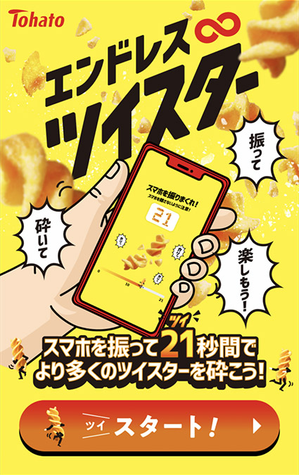 ふたつ目は、ブラウザゲーム「エンドレスツイスター」。スマホを振って、21秒間(「ツイ」スターとかけて)にどれだけ多くのツイスターを砕けるかを競うゲームだ。