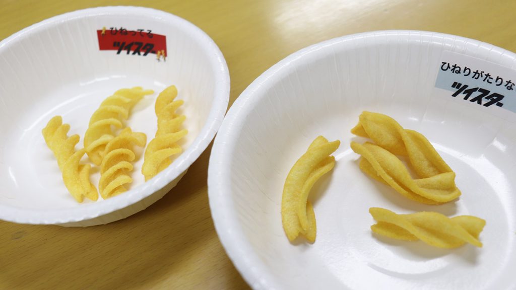 試食会では、さらに興味深い体験が用意されていた。完成品である「約5巻き」のツイスターと、ひねりが足りない「2~3巻き」の試作品の食べ比べである。
