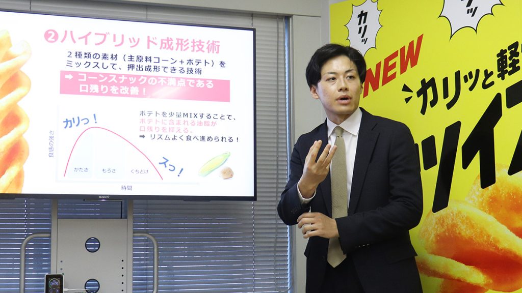 さらに、もうひとつのこだわりが「ハイブリッド成形技術」だ。主原料はコーンだが、実は少量のポテトが練り込まれている。コーン素材よりも油脂が多く含まれているポテトを入れることで、最後にじわーっと油が広がってスッと溶けるような口どけの良さを実現。
