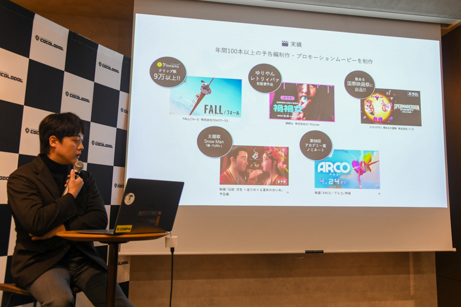本イベントを主催した株式会社ココロドルは、年間100本以上の映画予告編を手がけている2016年創業の企業だ。昨今では、地上600mの高層鉄塔に取り残されるという衝撃設定がSNS界隈中心に話題を呼んだ『FALL』、ゆりあんレトリィバァの初監督作で海外の映画賞でも高評価を受ける『禍禍女』、ナタリー・ポートマンが製作陣に名を連ね、今年のアカデミー賞長編アニメーション部門にもノミネートされている『ARCO/アルコ』などの予告編制作を担当している。そして、この日登壇した同社の密本雄太社長は、高IQの人々で構成されるMENSA会員に名を連ねているハイスペックな人物でもある。