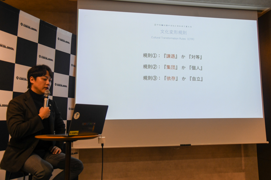 『アナと雪の女王』の予告編における日米対比を例に始めに紹介されたのは「文化変形規則」という考え方だ。これを映画予告編の制作に落とし込んで簡単に説明すると「国ごとの文化や規則に合わせて予告編の作り方を変える」ということ。「日常生活で外国人と話す際、どこの国の人だからこういうことは言ってはいけない、あの国の人だからああいう表現をされても仕方ないということが頻繁に起こったりしますが、その曖昧な違いを明示的に定式化しようというのが、この文化変形規則の考え方です」と密本氏は説明を加える。