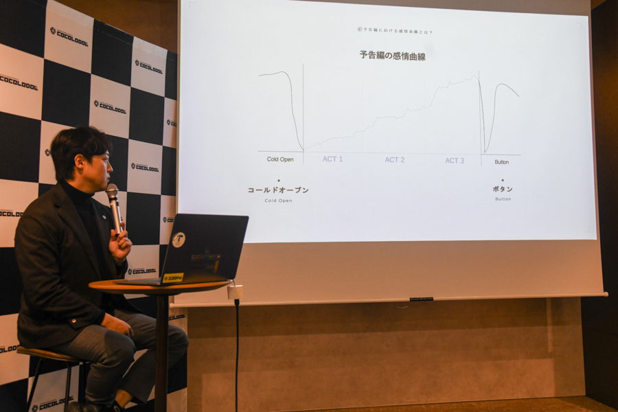 上記3つのまとめ的位置付けとなる4つ目のキーワードでは、「弊社のクリエイターの机のそばにも貼られている」というグラフを投影しながら、「興味→没入→欲求」の三章構成で動くとされる人間の感情曲線を紹介。これを映画予告編に変換すると「世界観の設定(主人公や世界線の説明など)→問題定義(直面する問題や敵の紹介)→クライマックス(問題がどう解決されていくのか)」という三章になり、「理論的な証明というより、産業的に最適化された結果として、この理論をもとに作られる予告編が多い」と述べた。
