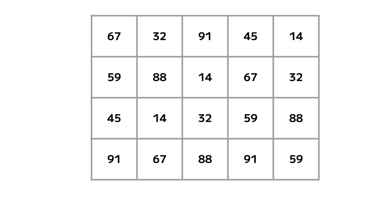 表を埋める「14・32・45・59・67・88・91」という7種の数字。