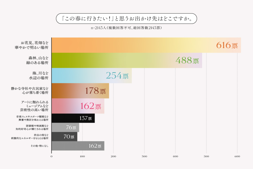 本フェアは、2025年秋から始動した「渋谷グルメ」を深掘りするプロジェクトの第3弾として企画された。今回は、渋谷で働く20代〜40代の女性を中心に「春のお出かけ気分」をテーマとした事前アンケート調査を実施。「アートに触れられる芸術的な場所」「華やかなお花見」「緑豊かな森林」といった回答から導かれた心理的な気分を、ピンク、イエロー、グリーン、ブラウン、ブルーの「5色の春色カテゴリー」へと細分化した。