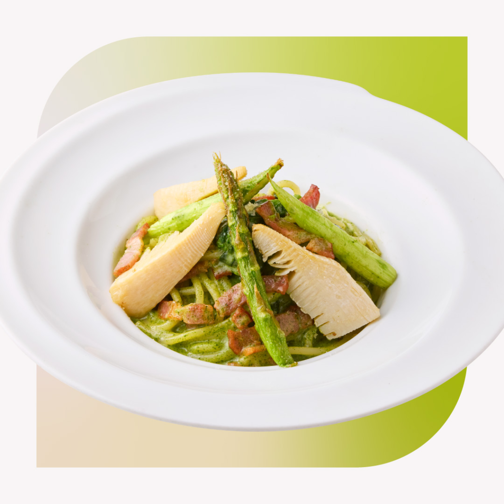 菜の花やたけのこなど春の味覚に、6種類のチーズソースを合わせた生パスタ。