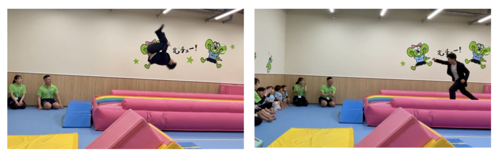 今回、なんと南氏がバク転やバク宙を披露!さすが元体操選手!子どもも大人も歓声を上げ、教室は大いに盛り上がりました。